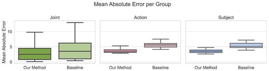 Figure 4 shows that both CMS and D3KE have relatively little variation across different movements and different participants, yet larger variations across individual joints. This is also reflected in median MAEs and per joint (Table 6), with median MAEs for joints varying within a range 3.8° for joints, while movements and participants vary under 1. It shows that D3KE generalizes well to different participants and movements.