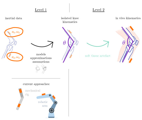 The need for cheaper and more mobile gait analysis solutions has recently been addressed with systems based on wearable sensors, such as inertial measurement units (IMUs). A key hurdle of relying on surface-mounted IMUs to derive joint kinematics is accurately estimating the orientation of the underlying bone segments. This task is made especially challenging by the need to estimate kinematic parameters from linear acceleration and angular velocity data instead of direct three-dimensional positions (as is the case with optical motion capture). Vitali and Perkins [10] recently identified four different categories of methods that tackle this challenge. One of these, the group of so-called “model-based” methods, was highlighted as offering obvious advantages, but requiring more thorough validation before widespread adoption is warranted. Unlike “assumed alignment” methods, model-based methods do not rely on a technician’s ability to visually align the IMU axes with those of limb segments, nor do they expect subjects to properly execute calibration movements, such as “functional alignment” methods do.