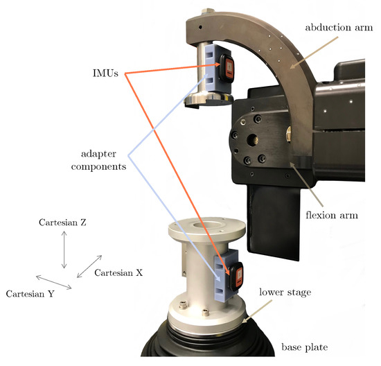 To investigate the accuracy of IMU-based systems to estimate flexion/extension, ab/adduction, and int/external tibial rotations, we established a simulator setup that was able to recreate tibiofemoral kinematics throughout in vivo measured functional activities of daily living. To achieve this, we applied the open-source kinematic data collected experimentally by Schütz et al. in 2019 [23]. In their study, a moving fluoroscope was employed to capture the tibiofemoral implant kinematics of six total knee arthroplasty (TKA) patients (average age of 72.8 ± 8.5 years; BMI 24.3 ± 2.2 kg/m2), each with a unilateral PFC Sigma cruciate retaining fixed-bearing prosthesis (Depuy Synthes, Warsaw, IN, USA), during level walking, stair descent, and sit-to-stand-to-sit. At the time of assessment, all subjects showed good functional outcome (Knee Injury and Osteoarthritis Outcome Score 91.2 ± 5.7, no/very low pain) and were measured in the gait lab at least 1 year post-operatively (4.2 ± 3.5 years). This subject-specific data was used as input to guide the kinematics of two independent arms of the joint simulator (described below). Output measurements of the physical rotations actually performed by the simulator then served as ground truth data in order to investigate the accuracy of IMU-based angle derivation.