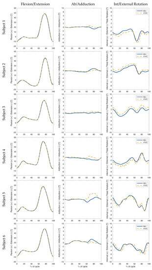 Although intermittently disrupted by large peak errors (Table 2), the assessed algorithm for IMU-based joint estimation (mainly selected for use in this study due to its flexibility in sensor placement) demonstrated good average accuracy over the assessed activities. Nonetheless, RMSEs of up to 7.5° for individual subjects suggest that the algorithm still requires further enhancement to ameliorate the errors affecting out-of-sagittal plane rotations during activities besides level walking (e.g., by modelling additional constraints imposed by the ankle joint during sit-to-stand-to-sit). Moreover, from a clinical perspective, errors of 7.5° could also critically lead to a different interpretation of joint functionality, particularly if this addresses ab/adduction or int/external rotation. As a result, there is a critical requirement to further develop approaches to mitigate cross-talk in kinematic datasets. Other methods that have attempted to quantify human joint kinematics using IMU technology have utilised different filter implementations [39,40], sensor fusion methods [12,40] and biomechanical models [14] to address drift and attain accurate movement patterns. While the algorithm implemented here is only one of many different approaches to joint angle estimation based on inertial data, the presented framework allows for a standard assessment and comparison of similar solutions.