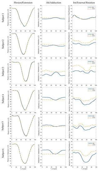 The collected kinematic data showed the highest levels of accuracy were associated with flexion/extension angles during level walking (Table 1, for subject-specific values see Table A1), with an RMSE below 1.0° for all three rotations (Figure 3). The largest errors in ab/adduction occurred between 60% and 90% of the gait cycle for level walking, and between 40% and 80% for stair descent (Figure 4). In the case of sit-to-stand-to-sit, the highest ab/adduction uncertainties occurred at the beginning and end of the activity cycle, when joint flexion was highest (Figure 5). No clear patterns were recognisable for int/external rotation errors. In general, the flexion/extension rotations were subject to the smallest errors. The largest RMSEs for all three rotations occurred for sit-to-stand-to-sit, with values of 0.9°, 3.1° and 4.8° in the sagittal, frontal and transverse planes, respectively.