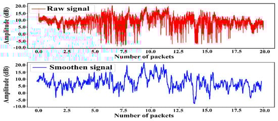 Noise is created in the raw amplitude of the CSI signal due to high-frequency environmental noise and multipath effects during propagation, reducing the final recognition result. Therefore, before feeding to the model, it is vital to eliminate this high-frequency noise. Hence, in this work, we used a Butterworth filter to denoise the raw signal and retain full information of activity. Gaussian smoothing was then applied to attenuate the minor peaks. Figure 2 shows the raw and smoothed CSI signals for the Run activity. The duration of the recorded CSI signals can vary, and processing a CSI signal with a longer length requires both more time and computational power. We experimented with various window lengths and observed that using a window length of 512 yields the highest recognition accuracy. Therefore, we made use of a sliding window with a size of 512 and a stride of 128 on both datasets.