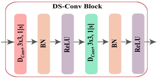 Every DS-Conv block is made up of DConv with kernels of stride 1, followed by batch normalization (BN), ReLU, and PConv with kernels of stride 1, followed by BN, ReLU. The schematic diagram of DS-Conv is presented in Figure 4.
