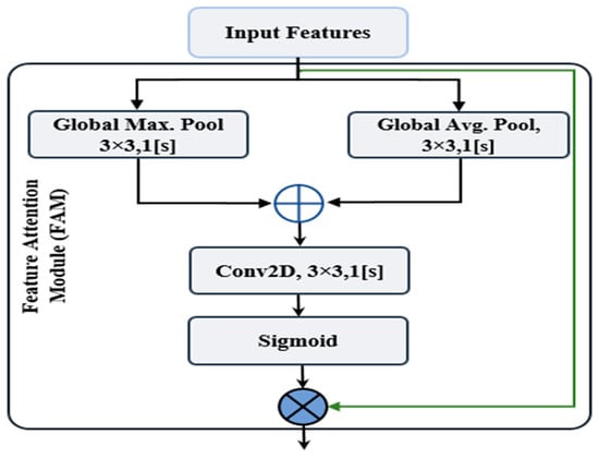 As shown in Figure 5, the input features () undergo global max pooling and global average pooling operations in parallel: and where and presents max pooling and average pooling, respectively. A 2D convolution operation is employed after an element-wise concatenation with a single kernel and a stride size of 1. The output feature map is linearized by the sigmoid activation function (x). To get final features , using element wise multiplication, is also matched with input features ().