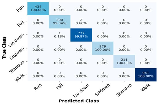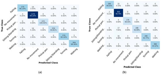 Figure 8a,b show the confusion matrix of the proposed STC-NLSTMNet model for the LOS scenario (E1 and E2). In the E1 scenario, the activities, i.e., Falling, No movement, Pickup pen, Turning, and Walking, have over 96% recognition accuracy, whereas only the Sitting/Standing activity shows less (about 94%) performance. On the other hand, the activities, i.e., Falling, No movement, Pickup pen, Sitting/Standing and Walking, show recognition accuracy greater than or equal to 92%, while only the Turning activity shows about 91.77% accuracy in the E2 scenario. There is some misclassification between the No movement and Sitting/Standing activities for both E1 and E2 scenarios. The possible reason could be that the signal pattern between the two activities is similar.