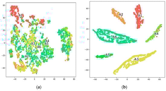 Two-dimensional T-SNE visualization of the testing data before (a) and after (b) learning representations of the proposed STC-NLSTMNet model.