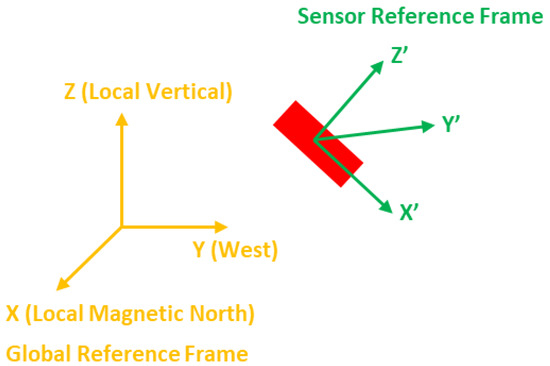 The sensor reference frame is changing all the time with respect to the change in the sensor orientation. In order to obtain the position estimation, a fixed reference frame is needed, and, in this work, global reference frame is used. As shown in Figure 1, the global reference frame is an earth-fixed reference frame in which the positive x direction is pointing to the local magnetic North, the positive y direction is pointing to the West according to the right-handed coordinate system and the positive z direction is pointing up, in the opposite direction to the Earth’s gravitational field.