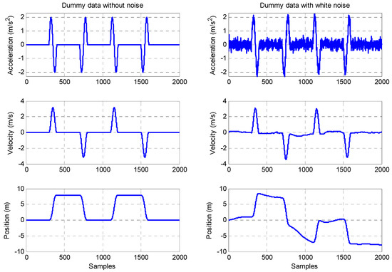 Dummy data which represent a typical ideal acceleration profile in one axis are used here to illustrate the DR algorithm for position tracking. In the left column of Figure 1, a sine wave has been used to create the acceleration dummy data whose maximum magnitude is 2 m/s2. Velocity and position have been computed by using the DR algorithm, and therefore an ideal example has been made. However, in real measurements, there exists noise and offset in the acceleration measurements. Therefore, the dummy acceleration data with white noise (mean value is 0.2 m/s2) were used to evaluate the performance of the DR algorithm when there is noise in the acceleration. The dummy acceleration data with white noise, the corresponding velocity and the position integrated from this acceleration are presented in the right column of Figure 2. It shows the significant error in the tracking of the position when the white noise is included can be up to twice its initial value.