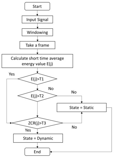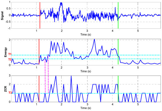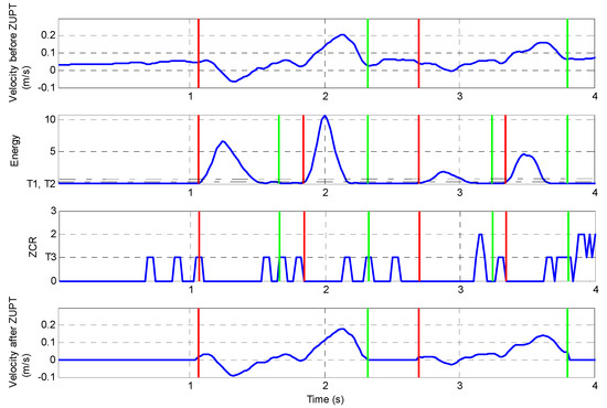 When applying the signal to Equations (5) and (6), the energy and ZCR are calculated. An example of the application of this process is shown in Figure 6 for the first two peg placements in the nine-hole peg test. The details of the process of double threshold method are illustrated in Figure 7. The red line and green line in Figure 8 represent the start and end of each peg insertion movement, respectively. Since one of the features is that the peaks in the velocity signal correspond to the peaks in the gyro energy, the start and end points in the velocity signal can be figured out. This algorithm will start from the first frame (according to the short-term energy), the comparison will be made between the low threshold value T2 and the short time energy. If the first point N1 exceeds the value T2 but the next point after N1 does not exceed value T2, this point cannot be treated as start point. If point N1 exceeds the high threshold value T1, N1 is the first start point. The same method is applied for detecting the end-point N2 as well. Now that the zero velocity events can be detected, the ZUPT algorithms can be applied to the measurements from the nine-hole peg test where there will be zero velocity at the point of peg pick up.