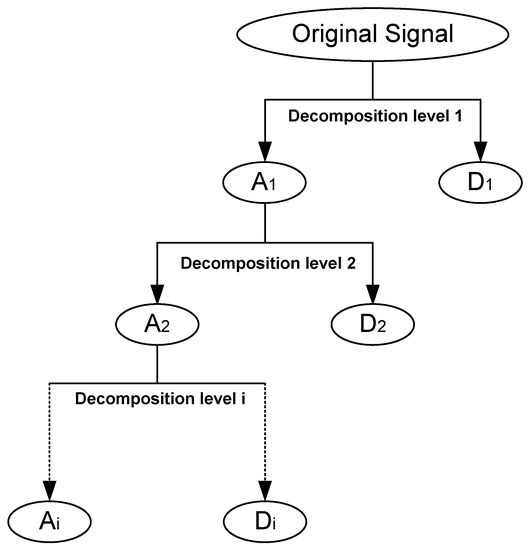 The signal is initially decomposed into two parts—approximation coefficient (A1) and detail coefficient (D1) and then A1 is decomposed into approximation coefficient (A2) and detail coefficient (D2) at the second decomposition level. A wavelet decomposition tree is presented in Figure 9.