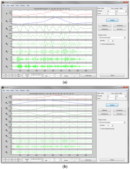 Wavelet analysis decomposition level. (a) Wavelet ‘db6’ level 6. (b) Wavelet ‘db6’ level 9.