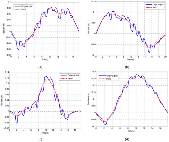 Low frequency offset variation after double integration (red plot is the low frequency trend). (a) Experiment Test 1. (b) Experiment Test 2. (c) Experiment Test 3. (d) Experiment Test 4.