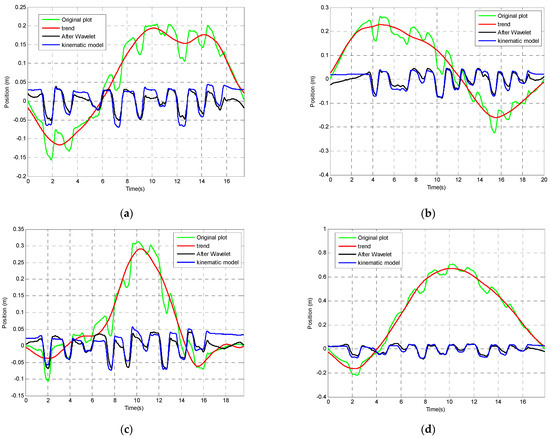 Drift correction for position using wavelet analysis. (a) Experiment Test 1. (b) Experiment Test 2. (c) Experiment Test 3. (d) Experiment Test 4.The result after applying the correction using wavelet analysis has been compared with the kinematic modelling tracking result which has been treated as a more accurate position tracking method (See Figure 14).