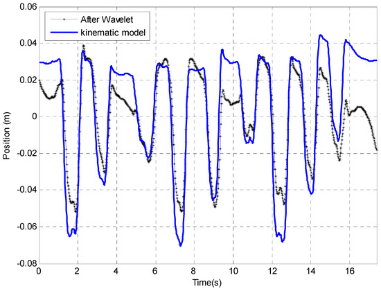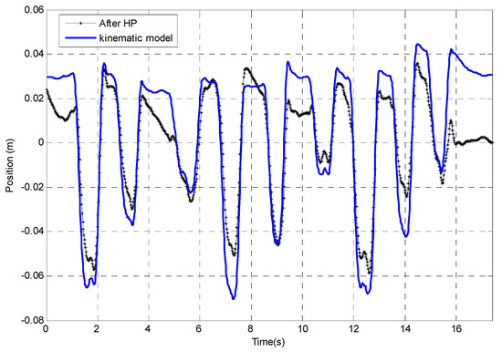 Although the position tracking after using the HP filter correction seems to have improved, it still deviates from the position computation by the kinematic model, especially at the beginning and the end of the plot (Figure 16).