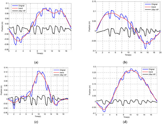 Drift correction result after applying the 0.03 Hz HP filter. (a) Experiment Test 1. (b) Experiment Test 2. (c) Experiment Test 3. (d) Experiment Test 4.