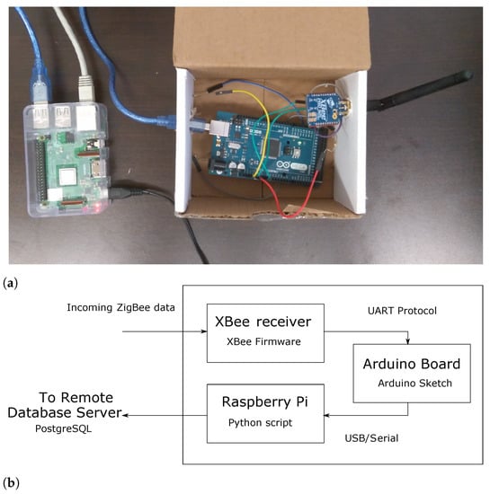 The base station (prototype version) and data flow. (a) A prototype of the base station. (Left): Raspberry Pi, (Right): Arduino and Xbee Pro© receiver; (b) data flow inside the base station.