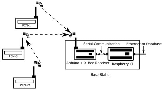 The wireless receiver in the base station is an Arduino Mega with an Xbee Pro radio, the same as that in PCFNs. A Raspberry Pi model 3B+ was selected as the computer, which runs a Linux-based operating system. The Pi has internet connectivity via both Ethernet and WiFi.