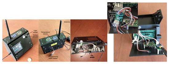 A production version PCFN device is shown in Figure 4. Instead of using the entire Arduino Mega board and the sensors with their breakout boards, the main processor of the Arduino, and the main components of the sensors were used in a printed circuit board (PCB) that was custom designed by the vendor. This version was also more convenient for assembly and disassembly. In the case of the base station, only the receiver node (radio and microprocessor) changed, and the computer stayed the same (Raspberry Pi).