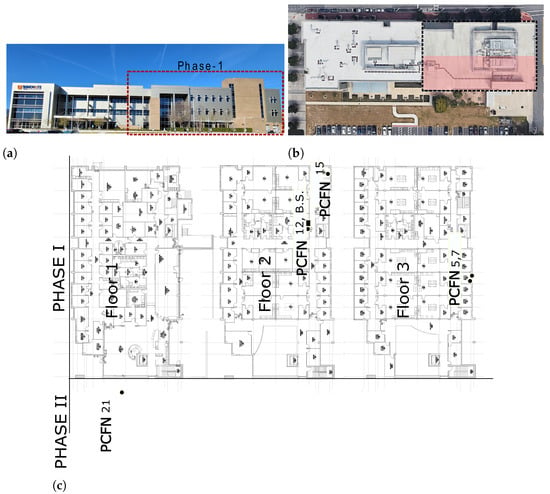 The deployment site, iHub (innovation hub), located at the University of Florida campus, and locations of PCFNs inside iHub. (a) Picture of the Innovation Hub building (view from south to north). Phase-1 is enclosed in the dashed lines; (b) top view of iHub. All but one of the PCFNs are deployed in the southern half of Phase-1 (shaded in blue)—served by an air handling unit (AHU-2). Imagery ©2021 Maxar technologies, U.S. geological survey, Map data ©2021 Google, maps.google.com (22 January 2021); (c) locations of the PCFNs deployed in iHub and that of the base station (marked as B.S.).