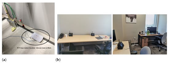 Figure 5 shows the building. The locations of the PCFNs in the building are shown in Figure 5a. The base station is shown in Figure 6a, which was installed in an unoccupied room that houses communication equipment, allowing access to an Ethernet port without disruption or raising concerns about clutter. The base station hardware, including the radio and antenna, is inside the plastic box for protection from the environment.
