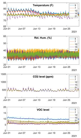 The PCFNs transmit data every 10 s, except for those instances when the user presses the “update” button. More than 99% of the samples were received with an inter-sample interval of 10 s, showing highly successful data transmission and reception despite the spatial variability of the deployments. A time series of four environmental variables collected from the PCFNs for the month of June 2021 is shown in Figure 7.