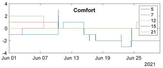 The comfort perception feedback provided by the corresponding users is shown in Figure 8. Occupants only intermittently interacted with the PCFNs. The user of PCFN 5 has provided the most amount of feedback during the period, and this user’s comfort has varied and fluctuated over time, between quite hot to quite cold. That is consistent with the environmental measurements shown in Figure 7: this PCFN has seen some of the largest (and most) variations in the indoor climate among those recorded. Similar fluctuations in temperature are also present for PCFN 7, but this user provided limited feedback. This difference may be attributed to the differences among users’ personalities or thermal comfort perceptions. Due to the small sample size, not much more can be said at this stage. Since PCFN 12 was installed in an unoccupied room, there is no occupant interaction; so its comfort value always remained at 0.