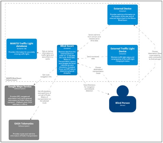 The proposed system allows for safe and highly precise outdoor blind pedestrian navigation without requiring the mandatory use of tactile ground surface indicators. The system employs voice instructions to continuously inform the user about the status and progress of the navigation and the various obstacles found along the navigational path. Central to this system is an Android application that aggregates data from two different sources, namely an external high-precision GPS receiver tracking real-time pedestrian mobility, a second custom-made external device consisting of an ultrasonic sensor and a servo mechanism that resembles a sonar device in its functionality, and a third custom-made waterproof device attached to traffic lights for identifying their status. The external high-precision GPS receiver (NEO-M8N) leverages information from multiple (up to 16) satellites enabling the system to provide centimeter-level location precision (~10 cm). From trials reported in [41], besides demonstrating its excellent precision unprecedented for blind pedestrian navigation, it also demonstrated significant improvements in the observed deviation from the actual user location when compared to the smartphone-integrated GPS receiver. The deviation is a crucial factor that can negatively impact the robustness of pedestrian navigation. Specifically, the deviation of the external receiver is measured to be less than 0.4 m, when receiving signal from 11 satellites, while the readings from the smartphone-integrated GPS receiver deviate in the order of 10 m. By utilizing this receiver, the application has information on the user’s latitude, altitude, speed, bearing, date, time, and number of satellites used.