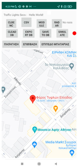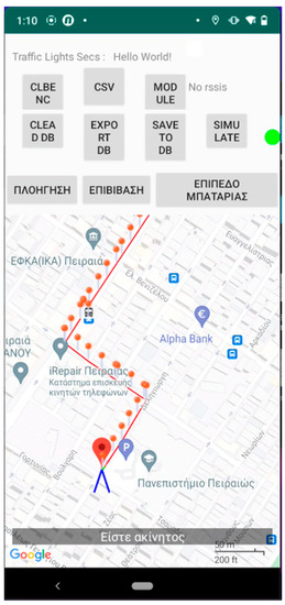 The menu on the upper part (see either Figure 2 and Figure 3) allows the instructor to access the features of the app. Specifically, it provides the route simulation features such as (1) selecting the JSON file to load a route via the “Navigation” button located on the first position from the left of the bottom three (described in Greek), (2) the button responsible for simulating the process of boarding a bus and the battery level notification (second and third from left of the bottom three, respectively), (3) the feature to record, import, and export routes made by the blind and visually impaired users, and, finally, (4) starting and stopping the simulation of the selected route.