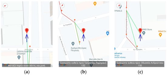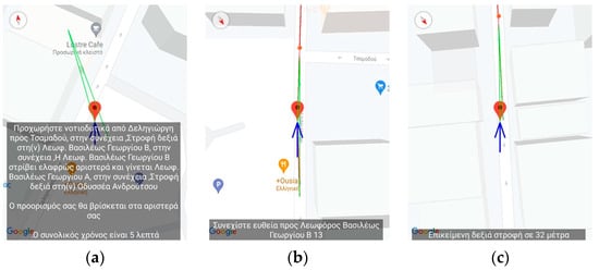 Application’s Training version—Midway through the virtual navigation. The figures display the navigation messages issued from the application. The translation of the text is as follows: (a) The user deviates from the correct navigational pat and the application issues the following error-correction message: “The correct direction is between 6 and 7 o’clock”, (b) “Continue straight ahead towards Grigoriou Lampraki 132”, (c) “Continue straight ahead towards Androutsou 150”.