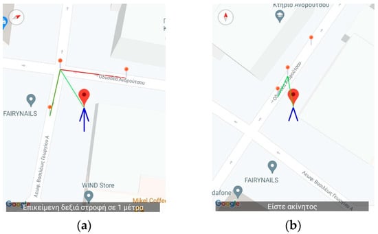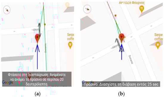 Application’s Training version—Snapshot from simulating the passage of the crossing near the traffic light of the Doiranis and Athinas junction in Kallithea. The translation of the issued message displayed on (a) is: “You have reached the intersection. Wait for 20 s until the traffic light status is green” while for (b) is: “Green. You can pass the crossing. Remaining time 25 s”.