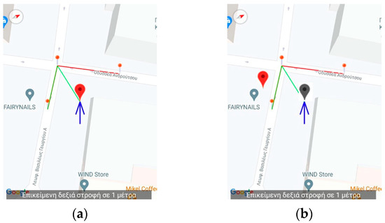 Application’s Training version—Snapshot from a simulated route (a) while it is being replayed. The instructor pauses the replay and selects to move the position of the user in an arbitrary location on the map in order to demonstrate the behavior of the app when a wrong turn event occurs. Upon selecting the new position, the old is grayed out (b). The text in both figures displays the message when the instructor paused the replay: “Upcoming right turn in 1 m.