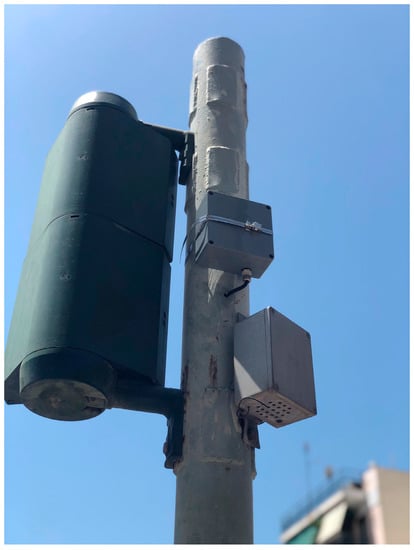Specially mounted external device on a real traffic light located at the junction of Doiranis and Athinas in Kallithea.