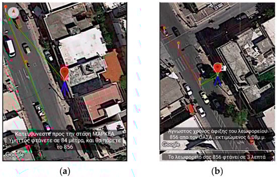 Application’s Training version—Snapshot from simulating pedestrian navigation coupled with public means of transportation. (a) depicts the following message: “Heading toward MARKEA—Ymittos stop at 84 m distance. You will take bus line 856” while (b) the message: “Unknown time of arrival for the bus line 856 from the Telematics Service”, and “The bus line 856 is estimated to arrive in 3 min”.
