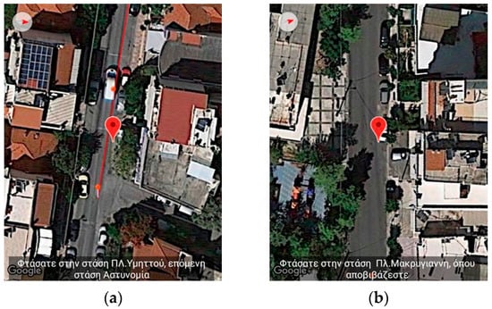 Application’s Training version—Snapshot from simulating pedestrian navigation combined with public transportation. (a) depicts the message when reaching and passing intermediate bus stops “You reached Ymittos square stop. Next stop Police” while (b) displays the message “You reached Makrigianni square stop. You exit here”.