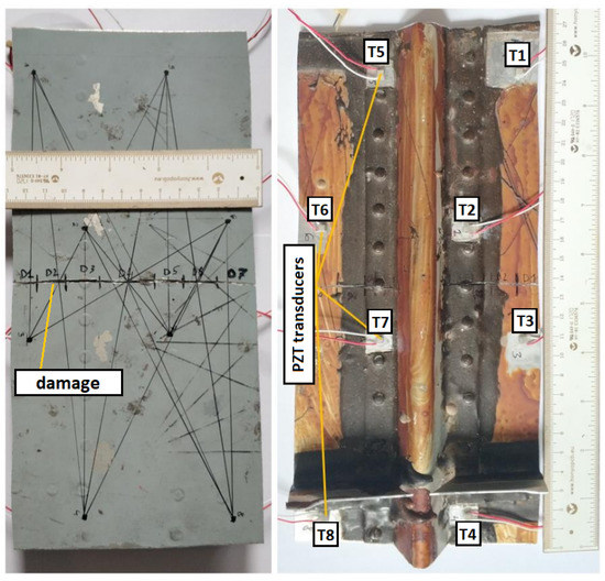 Both PZT networks were composed of 8 PZT sensors. In the case of specimen no. 1, multilayered PZT sensors of the type NAC2002 manufactured by Noliac A/S were used [41]. The sensors were attached to the surface of the specimen, both on the skin part as well as on the reinforcement (Figure 2). For specimen no. 2, single-layered PZT transducers produced by STEMINC (mod. SMD05T04R111WL) were applied [42]. The sensors were embedded into the internal structure of the composite panel in its symmetry plane. For sensors excitation and signal acquisition, PAQ16000D manufactured by EC Electronics (Poland) has been used [43]. As the excitation signal, Hanning windowed, 3-period sine signal at 150 kHz frequency was used in both cases.