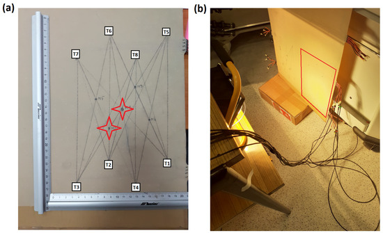 View of specimen no. 2: (a) PZT sensors network geometry with an indication of introduced impact damage location; (b) specimen heated with the use of halogen lamps with an indication of the monitored area.