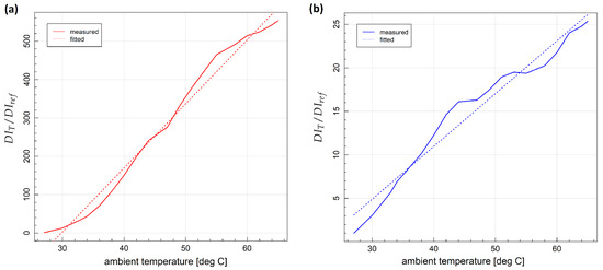 Dependence of relative change of damage indices on temperature for specimen no. 1: (a) damage index; (b) damage index.