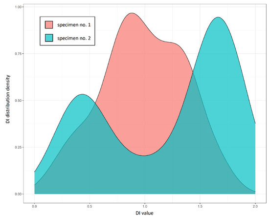 Distribution of damage index for the two specimens at a temperature above 60 C without damage presence.