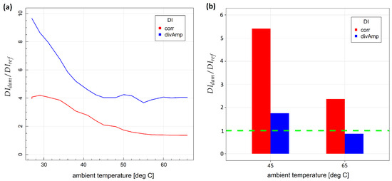 Variability of damage indices with respect to temperature change: (a) specimen no. 1; (b) specimen no. 2.