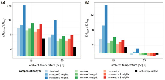 In Figure 10 and Figure 11, damage detection efficiency ratio , defined by the Equation (20) and obtained for different schemes of damage indices compensation, is shown for specimen no. 1 and specimen no. 2, respectively. For specimen no. 1 (Figure 10) median values of obtained for indicated temperature range are shown. The linear scale was applied for the presentation of the results obtained for specimen no. 1 (Figure 10), in the case of specimen no. 2 (Figure 11) logarithmic scale was used. The dashed line in both plots represents , which is a limiting value for the possibility of distinction of sensing paths influenced by damage and thus SHM system applicability. For all compensation schemes, the ratio in most cases is higher if the compensation formula is used. The best damage detection capability was obtained for the standard compensation procedure given by the Equation (13), irrespectively of DIs or damage type as well as temperature range. Moreover, damage detection efficiency is enhanced if more sensing paths are included in sets used for estimation of Damage Indices drift effects, the best results were observed for for all compensation formulas. For damage index coefficient was about 10 for specimen no. 1 at temperatures above 55 C (Table 1) and about 33 for specimen no. 2 at temperatures about 65 C (Table 2), and it was, respectively, about 750% and 1400% higher than obtained for uncompensated damage index. For damage index damage detection efficiency coefficient at the highest temperatures was about 22 for specimen no. 1, which was 540% higher than obtained for uncompensated damage index (Table 3). For damage index obtained for specimen no. 2 at the highest temperature (Figure 11b, Table 4) coefficient was about or below 1, except for standard compensation scheme with for which obtained was about 1.5. This means that without the application of proper compensation formula, the damage could not be detected, as the distinction between sensing paths close to damage and reference sensing paths wouldn’t be possible.