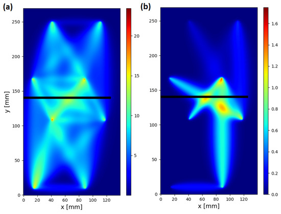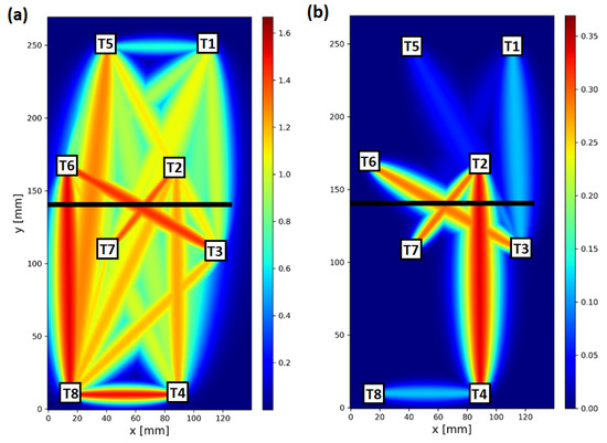 In Figure 12, visualization of raw and compensated damage index values within the network for specimen no. 1 above 60 C is shown. In both cases, the colormap was automatically adjusted to be 10% higher than the maximum value of DIs obtained within the network. As the compensation formula (Equation (13)) reduces DIs values for all sensing paths of the network, the use of individually adopted colormaps is legitimate, since also the threshold for damage indication should be adjusted accordingly for structure assessment based on compensated DIs. Before compensation, sensing paths not sensitive to the transmission mode of elastic wave interaction with introduced damage, for which significant value was obtained due to temperature influence, were as follows (Figure 12a): 1–5, 2–5, 3–8, 4–7, 4–8, 7–8. In particular, the value for sensing path 4–8, located at a significant distance from damage, was comparable to the DI value obtained for sensing paths transversal to damage. After compensation (Figure 12b), from the mentioned sensing paths, a significant value was obtained only for sensing path 4–8, so the temperature influence was still significant in this case. In Figure 13, averaged visualization maps, based on RAPID imaging algorithm [38,39], obtained for raw and compensated data are presented. Application of the proposed compensation formula allows not only for the improvement of contrast between damage-influenced and reference sensing paths but also provides a better basis for damage localization. Averaged damage intensity map obtained for compensated index is more confined to the damaged region of the specimen (Figure 13b) than in the case of raw DI (Figure 13a).