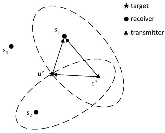 Target localization has been a prevalent research topic with numerous applications in wireless sensor network (WSN) [,,], communications [], radars [,,], and many others. A straightforward method to locate a target is direct localization [], in which the position is determined directly from the received signals. The direct approach bears expensive computational complexity due to the multidimensional grid search. Hence, various types of indirect approaches have been presented based on different types of measurement information. The typical measurement information includes time of arrival (TOA) [,], time-difference of arrival (TDOA) [,,], received signal strength (RSS) [], arrival of angle (AOA) [], and their joint methods [,,]. Among them, localization based on time information holds great research significance owing to its high-positioning accuracy. Elliptic localization is a time-based positioning model that is superior to some typical localization models, such as TOA-based and TDOA-based models []. In this model, the transmitter sends out a radar wave and several synchronous receivers collect the signal reflected from the interest target to determine its position. In addition, when the transmitter position is unknown, the signal received directly from the transmitter is also used to improve the positioning performance. Such a multistatic positioning approach [] can offer more flexibility and better performance than the monostatic counterpart []. Hence, elliptic localization has been widely applied in multiple-input-multiple-output (MIMO) radars []. The flight time of the radar wave multiplied by its propagation speed produces the sum of the distances from the transmitter to the target and then to the receiver, which is referred to as the bistatic range [,]. The track of constant bistatic range in two-dimensional space is an ellipse with the transmitter and receiver positions as its foci, and the target position is on the ellipse. Thus, we can evaluate the target position by the intersection point of some ellipses produced by the bistatic ranges.