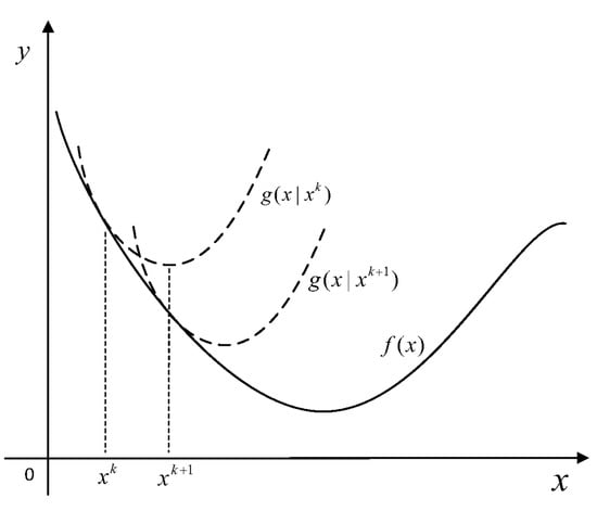 We can find that the surrogate function satisfies the conditions in (6), i.e., . Therefore, it is one of the tight upper bounds of the original cost function ( at the point (). Then, minimizing the surrogate function, the updating process is expressed as