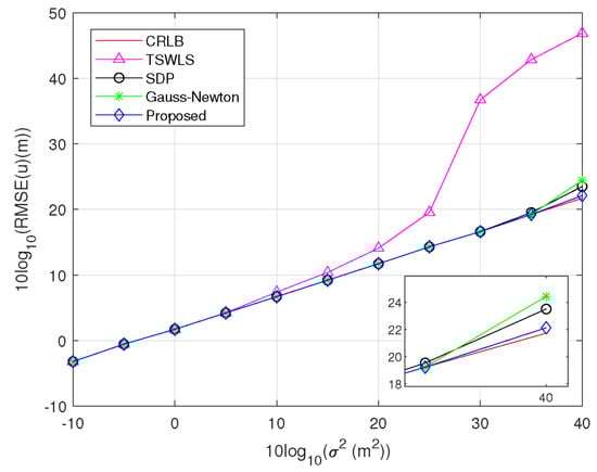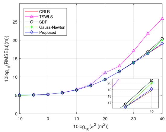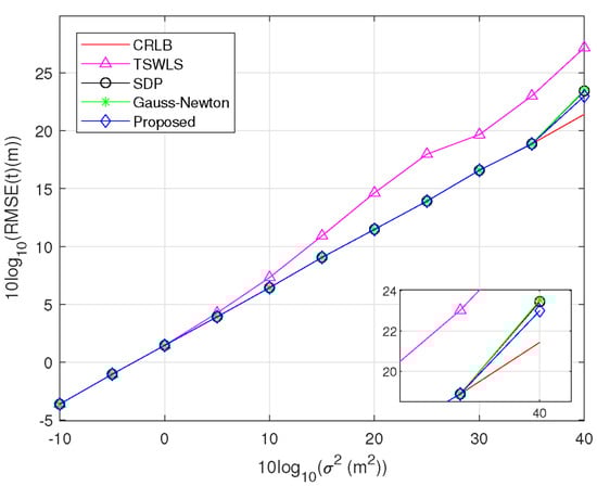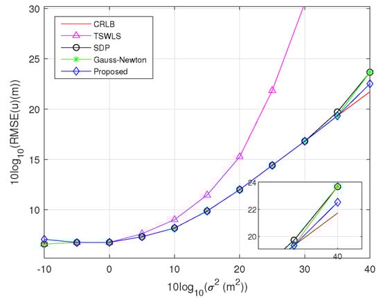 In this section, numerical simulations are conducted to evaluate the performance of the proposed method in 2-D for ease of illustration. The proposed method is compared with the SDP method [] (labeled as “SDP”), the two-stage WLS method [] (labeled as “TSWLS”) and the Gauss–Newton method (labeled as “Gauss–Newton”, the derivation is shown in Appendix A). Moreover, the CRLB is also included as a benchmark. Owing to many unknown variables in the objective function, we choose to initialize by successive estimation. The successive estimation can be regarded as a TOA localization problem (based on direct paths) and an elliptic localization problem (based on indirect paths). The TOA localization problem is solved to evaluate the transmitter position by the LS method in []. Then, using the evaluated transmitter position, the elliptic localization problem is solved to evaluate the target position by the LS method in []. Meanwhile, the receiver position errors are not considered. The noise variances of the indirect and direct paths are set to the same value (represented by ). The maximum number of iterations is set to and the predetermined threshold is set as .