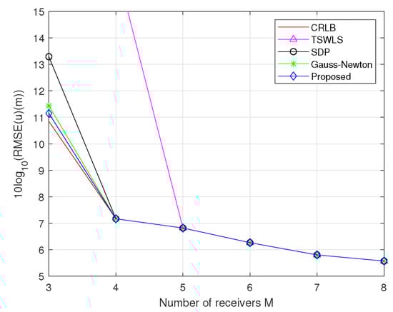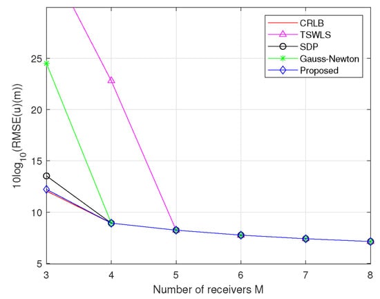 Scenario 3: In this scenario, the number of receiver M increases from 3 to 8. We let and , where , for and . The deployment of the actual coordinates of the target, transmitter, and receiver is the same as that in Scenario 1. As can be seen in Figure 6, the performance of these methods improves as the number of receivers increases. The RMSE of the TSWLS method deviates from the CRLB accuracy when . The proposed method, SDP method and Gauss–Newton method attain the CRLB accuracy at the entire tested range except for . For , the SDP method obviously deviates from CRLB; however, the proposed method and Gauss–Newton method just slightly deviate from CRLB, and the former has better performance.