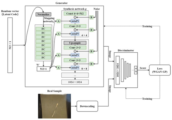 StyleGAN is proposed by Karras to generate high resolution and high diversity images. As shown in Figure 2, it is mainly composed of a generator (consisting of a mapping network and a synthesis network), a discriminator, and a loss function.