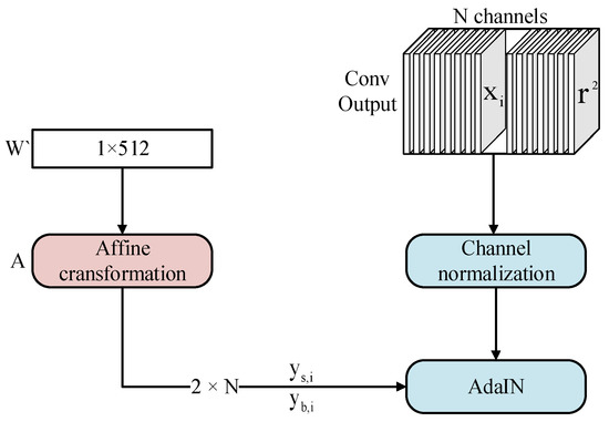 Firstly, the mean and variance of the convolutional layer output are normalized by channel, while W’ is expanded into a deflation factor and deviation factor by a learnable affine transformation A. The two factors are then weighted and summed with the convolution layer to complete W’s influence on the original output. AdaIN is added after each convolution operation; it affects each sub-network twice with different styles affected by images at different resolutions.