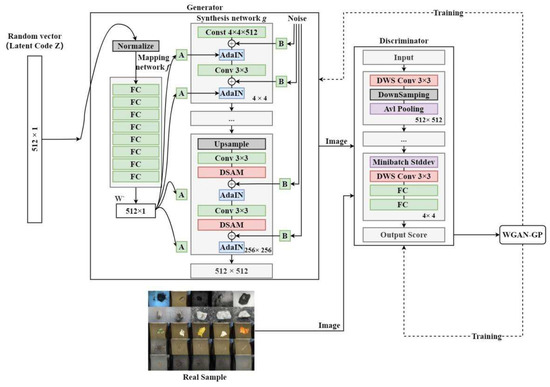 Image data augmentation methods are mainly divided into traditional augmentation and GAN (Generative Adversarial Network) based augmentation. Traditional augmentation methods are based on image processing, which mainly include geometric and color transformations, adding noise and filtering, random elimination, image blending, etc. [9,10]. At present, most of the research on coal foreign object image data augmentation focuses on traditional methods [11,12]. Traditional augmentation methods have great efficiency in image preprocessing, but they do not fundamentally solve the problem of insufficient foreign object data diversity, and are of limited help in foreign object detection. With the development of the data augmentation, GAN provides a new direction for image data augmentation, which can effectively solve the problems of small samples and data imbalance by generating a large number of samples with the same distribution as the real dataset [13]. The early GAN has disadvantages, such as gradient disappearance, gradient explosion, convergence difficulties, and low resolution of generated images. With scholars’ in-depth research on GAN, several works, such as WGAN [14], WGAN-GP [15], DCGAN [16], ProGAN [17], and BigGAN [18], have been introduced to gradually improve the training stability of GAN and the resolution of generated images, which laid the foundation for its application in machine vision tasks. Shi [19] added Wasserstein divergence to WGAN to improve the diversity of defect samples on the surface of micro-electromechanical systems (MEMS), and the experimental results showed that the mAP and F1 scores of defect detection were improved by 8.16% and 6.73%, respectively, after data augmentation. Deng [20] applied WGAN-GP to data augmentation for facial expression recognition, and improved the recognition accuracy of multi-angle facial expressions. In the field of coal mining, the application of GAN is still in the initial stage. In order to improve the accuracy of coal and rock recognition, Wang [21] introduced a pyramid structure in consinGAN to generate coal and rock images with a resolution of up to 250 × 250 by increasing from coarse to fine. Wang [22] incorporated a new convolution module in DCGAN to expand the resolution of generated images from 64 × 64 to 512 × 512, thus facilitating the training of coal-gangue detection models. The above research demonstrates the feasibility of applying GAN to visual recognition and detection tasks. However, coal foreign objects with diverse categories and irregular shapes impose higher requirements on the quality of the dataset, and the images generated by the above methods fail to achieve a balance between resolution and diversity to meet the needs of this paper.