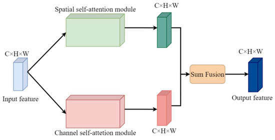 where denotes the input feature map, and and denote the spatial and channel attention operations on the input features, respectively. The final refined feature map is obtained by element-by-element summation of the two parts of the result.