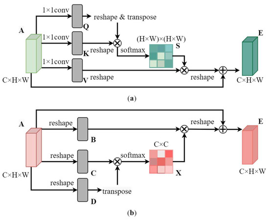 The details of spatial self-attention and channel self-attention. (a) Spatial self-attention module; (b) Channel self-attention module.